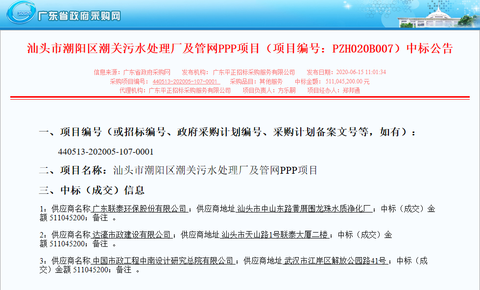 該項目通過公開招標方式選擇社會資本。根據2020年6月15日廣東省政府采購網(http://www.gdgpo.gov.cn/)披露的《汕頭市潮陽區潮關污水處理廠及管網PPP項目(項目編號:PZH020B007)中標公告》,經法定程序,廣東聯泰環保股份有限公司(牽頭單位)、達濠市政建設有限公司和中國市政工程中南設計研究總院有限公司聯合體被確定為該項目中標社會資本方。