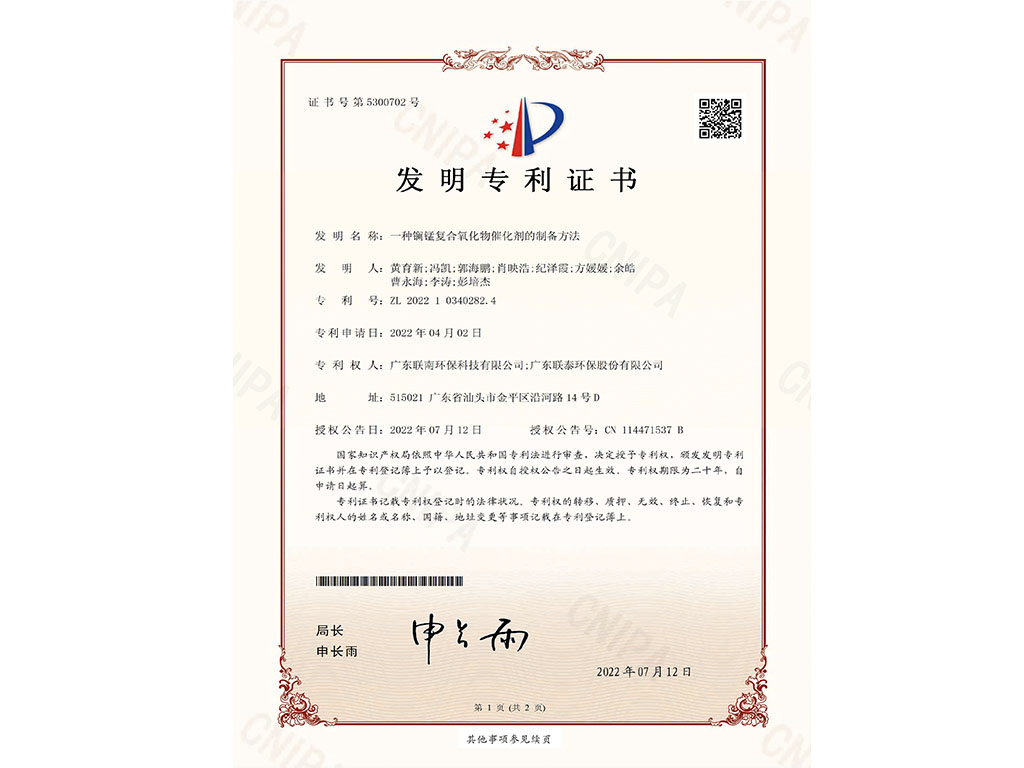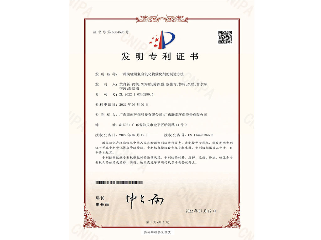 一種鑭錳銅復(fù)合氧化物催化劑的制造方法證書
